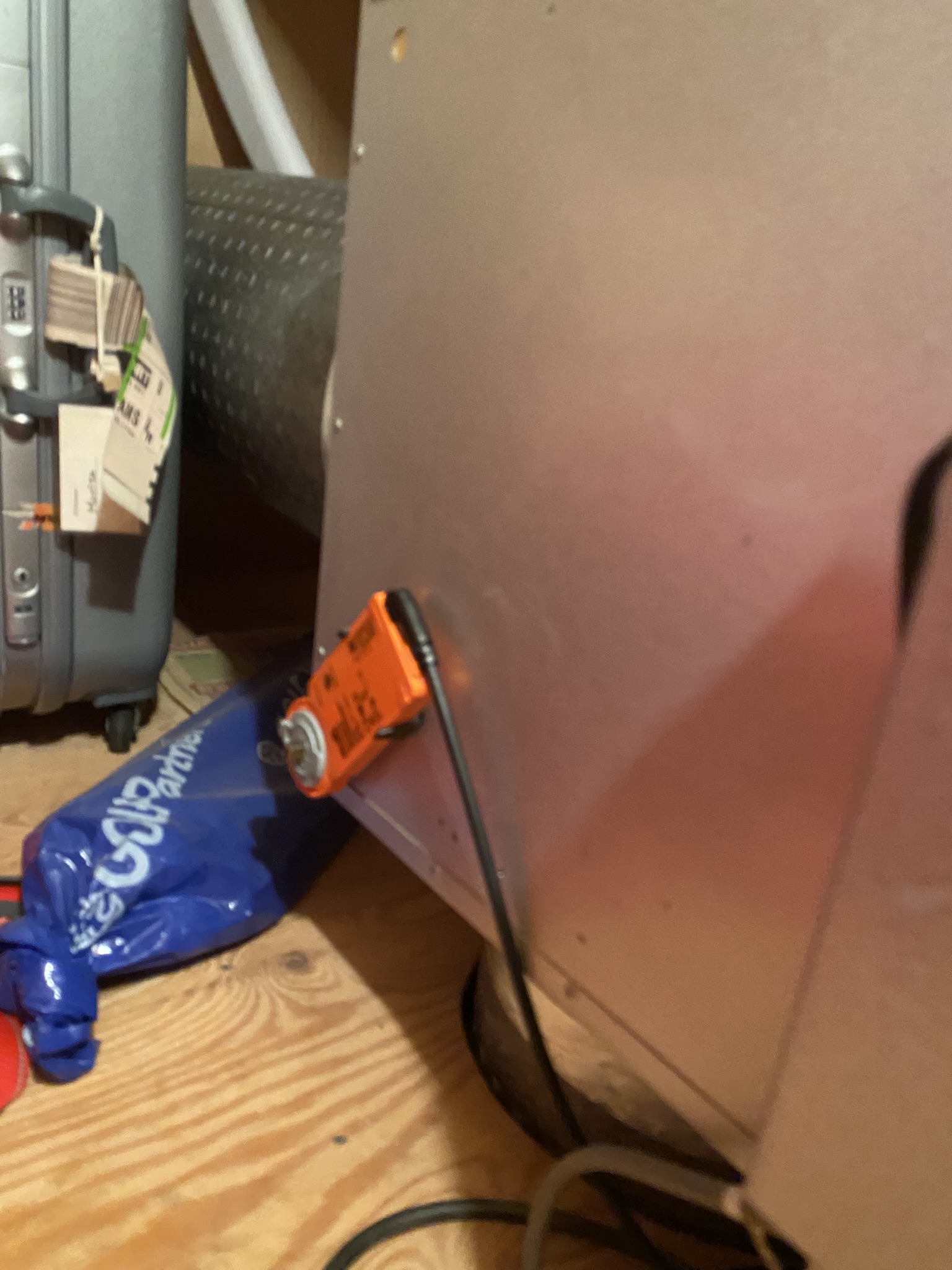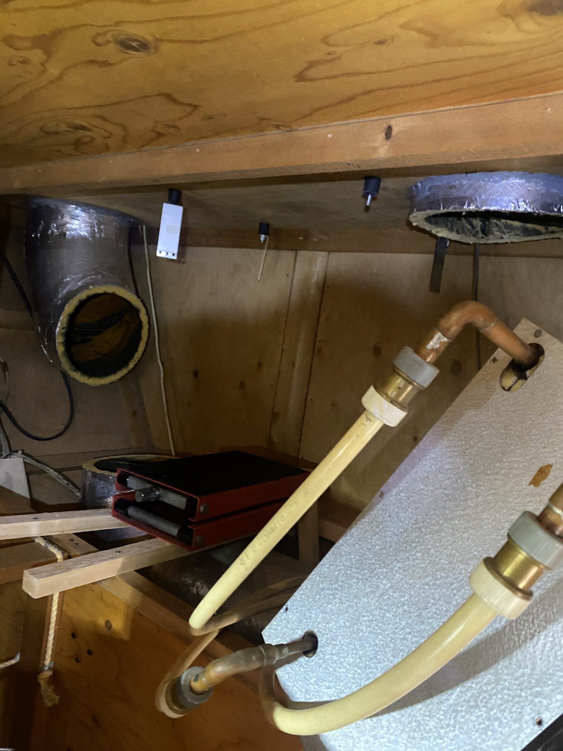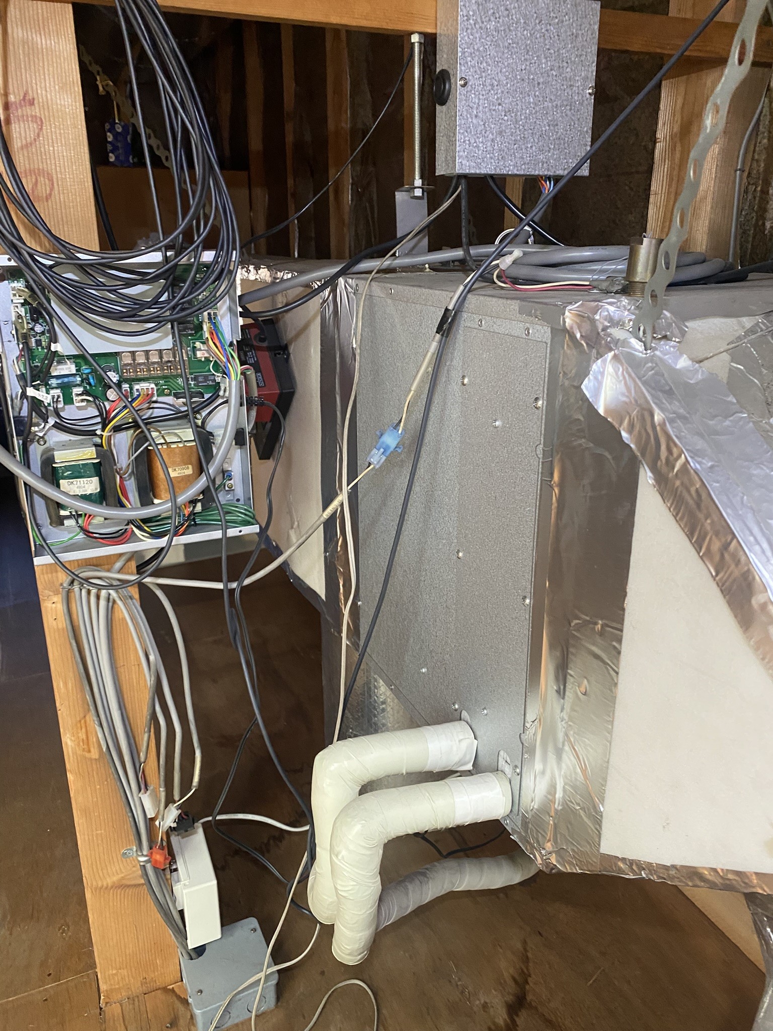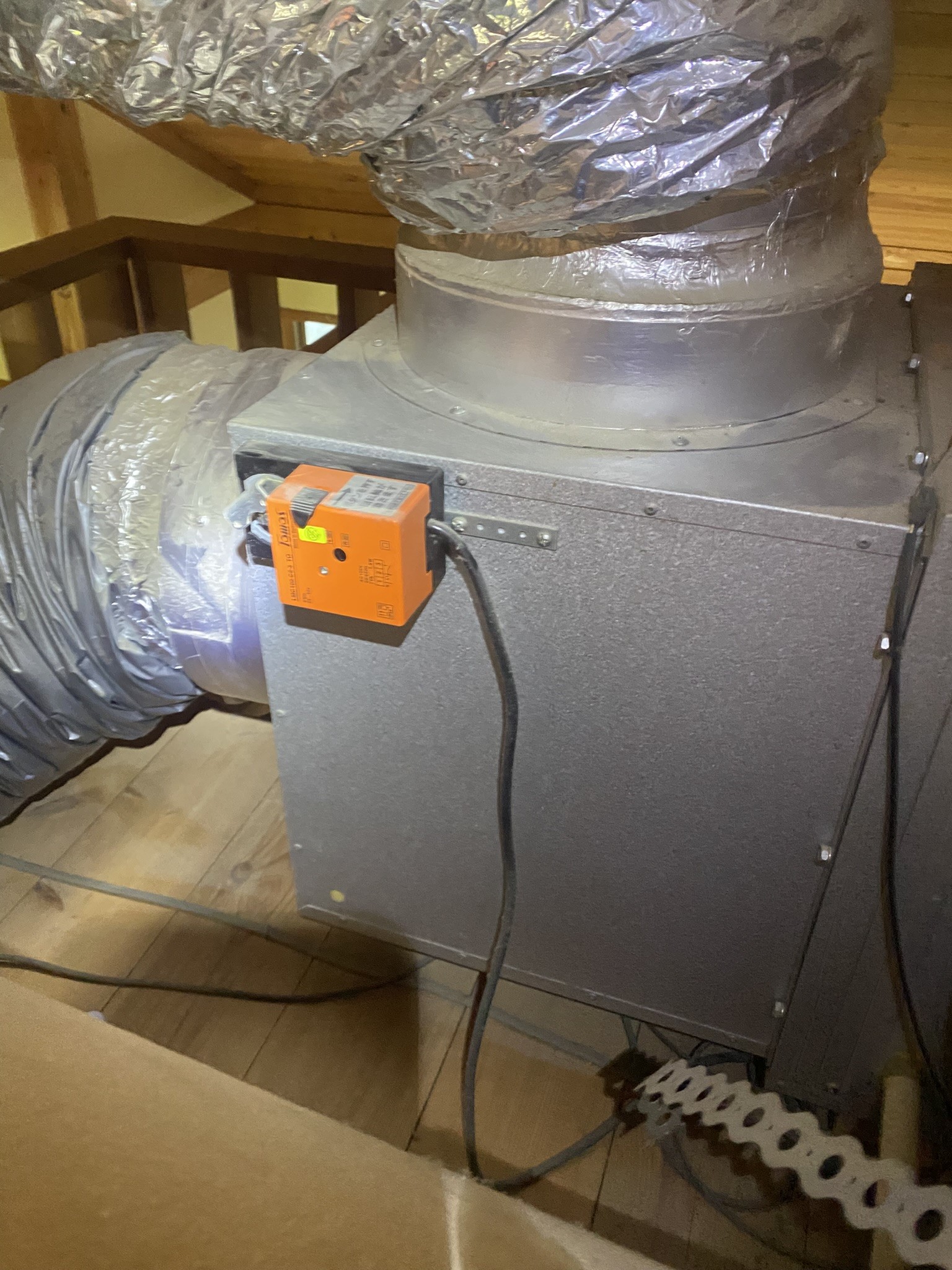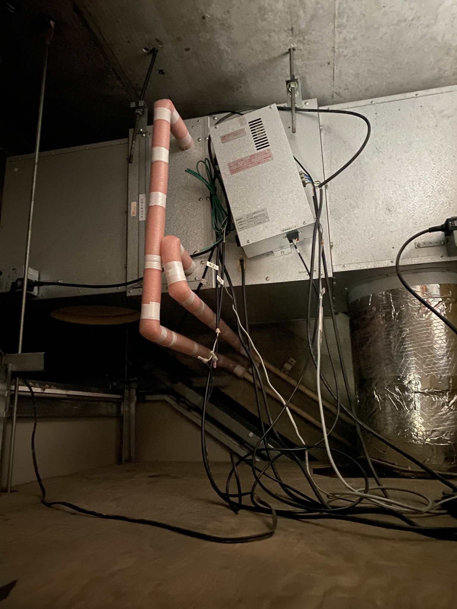 スーパーカミオカンデで有名な神岡町の物件。棟温度・室温・外気温など、センサーの表示がすべてだめになっているとのことで、制御盤が故障していると推定できた案件。関西からなら少し近いかと日程を合わせて現地訪問しました。古民家改築の現場であったためか、ハンドリングへの到達経路が大変厳しく、梁をよじ登る必要があり、非常に危険な現場でした。なんとか到達し、やっとの思いで制御盤パワーユニット&ダンパーモーターを交換させていただきましたが、今後長期にわたって交換不要とするための必要な処置と割り切って工事しました。写真は下からハンドリングを眺めているアングル。すでに梁の上でしたが、まだ登らなければならないのが大変でした。