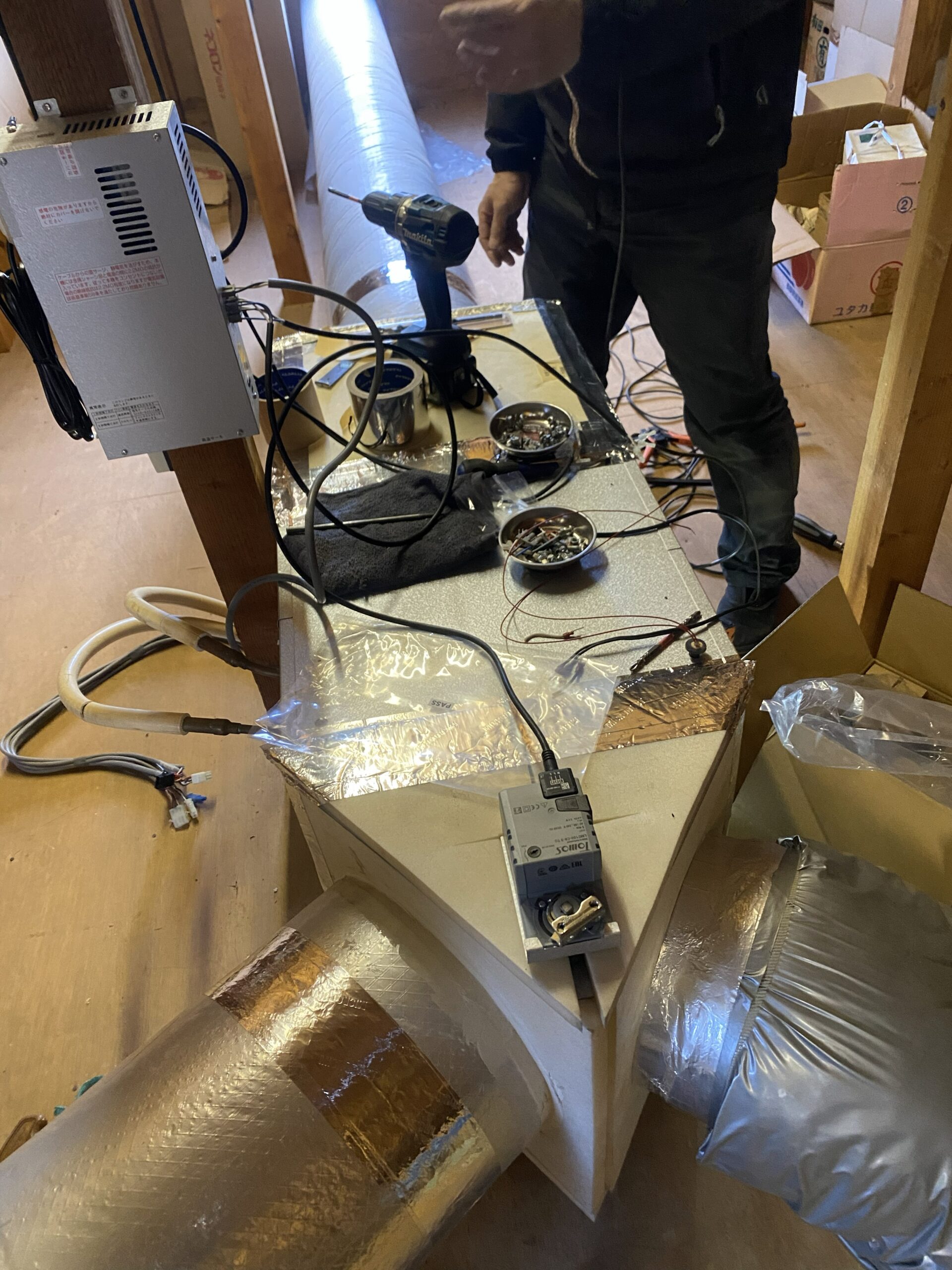 OMソーラーの動作不調とのことで、老朽化しているファンボックスのほか、制御盤、ダンパーモーターもすべて交換することになりました。順調に修理がすすみ、動作チェックも完了したとおもいきや、電源供給元として刺したコンセントが、小屋裏の照明スイッチと連動していたことに気づかず、「制御盤が消えていて操作できない」というお施主様からの問い合わせで再訪を繰り返すことになりました。動作チェックするときに、小屋裏の照明スイッチを入れるので、電源復活、私たちが退去したあとに、照明スイッチを消すので、ソーラーも電源オフになるというオチでした。