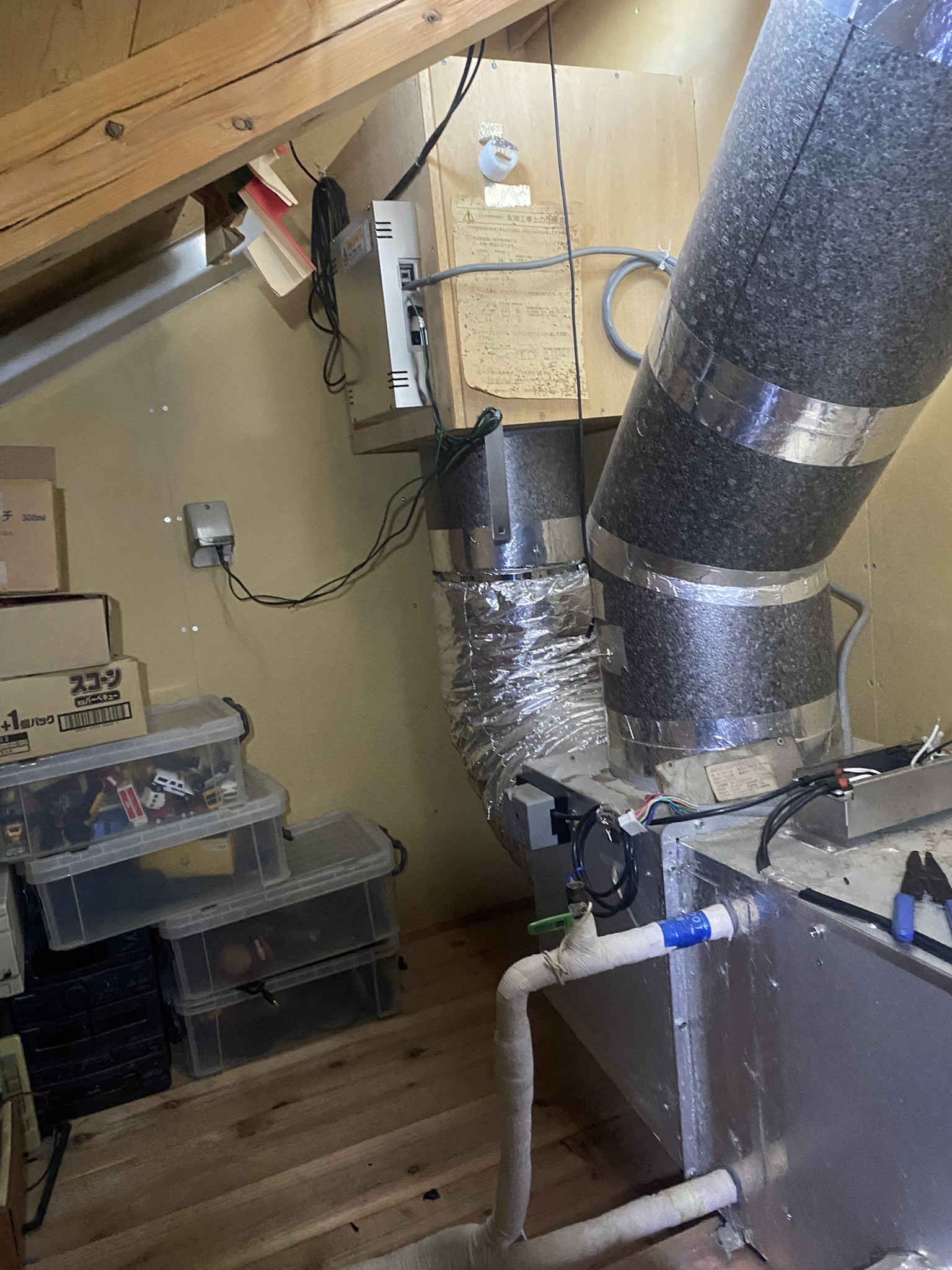 M型ハンドリングの故障とのことで修理依頼がありました。大崎型制御盤も老朽化しており、こちらも相談の結果、TC-10に交換することにしました。今回の工事の特徴は、お湯取りをもうしていないということだったので、熱交換コイルを取り外す工事を行ったことです。熱交換コイルを撤去すると、ファンボックスの交換が簡単に済ませることができるほか、風量もアップするため、太陽熱暖房の効果を高めることができます。小屋裏の作業スペースは広いため、工事は比較的楽であるかと思われましたが、ハンドリングの左右にある柱が絶妙に作業を邪魔しているところがやっかいでした。