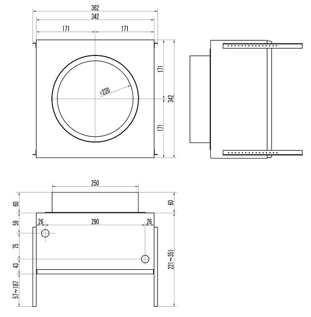 幅342mm × 奥行き 342mm × 高さ 221~351mm(フランジ60mm除く) |