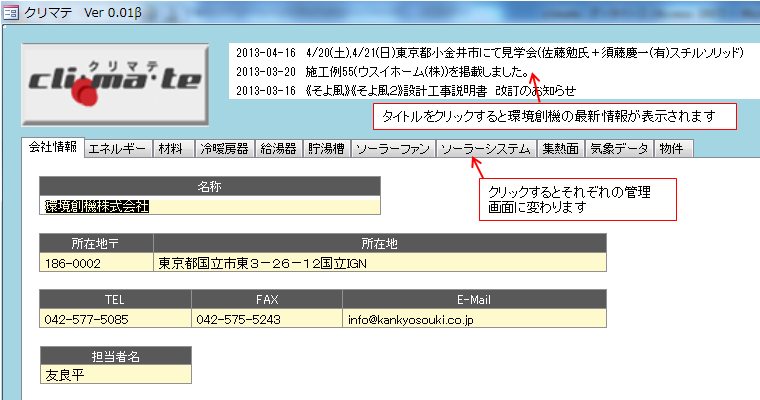 クリマテを起動すると、タイトルの後、下記の画面が表示されます。タブをクリックすると表示される管理画面が変わります。
